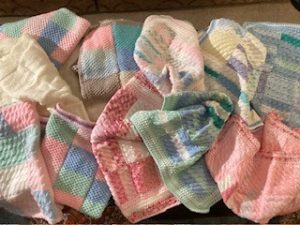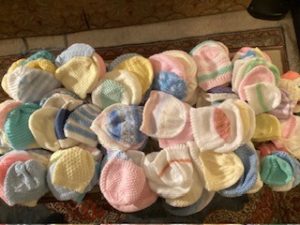 In all 369 pretty little bonnets in an assortment of colours and 11 beautiful blankets have been knitted so far and will be divided between the two Trusts.