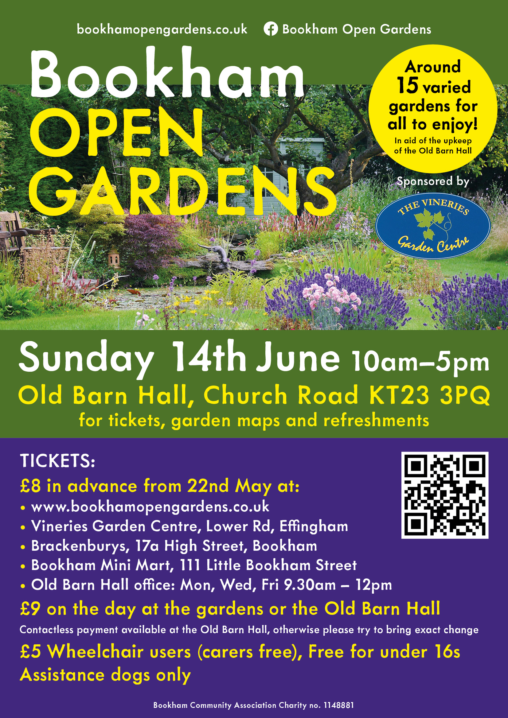 Tickets on sale from 22nd May: £8 online from www.bookhamopengardens.co.uk, or from the Old Barn Hall KT23 3PQ (Mon, Weds, Fri 9.30am-12 noon), the Vineries (event sponsors) & other local outlets, £9 on the day. You can also buy them at the first garden you visit. Assistance dogs only.