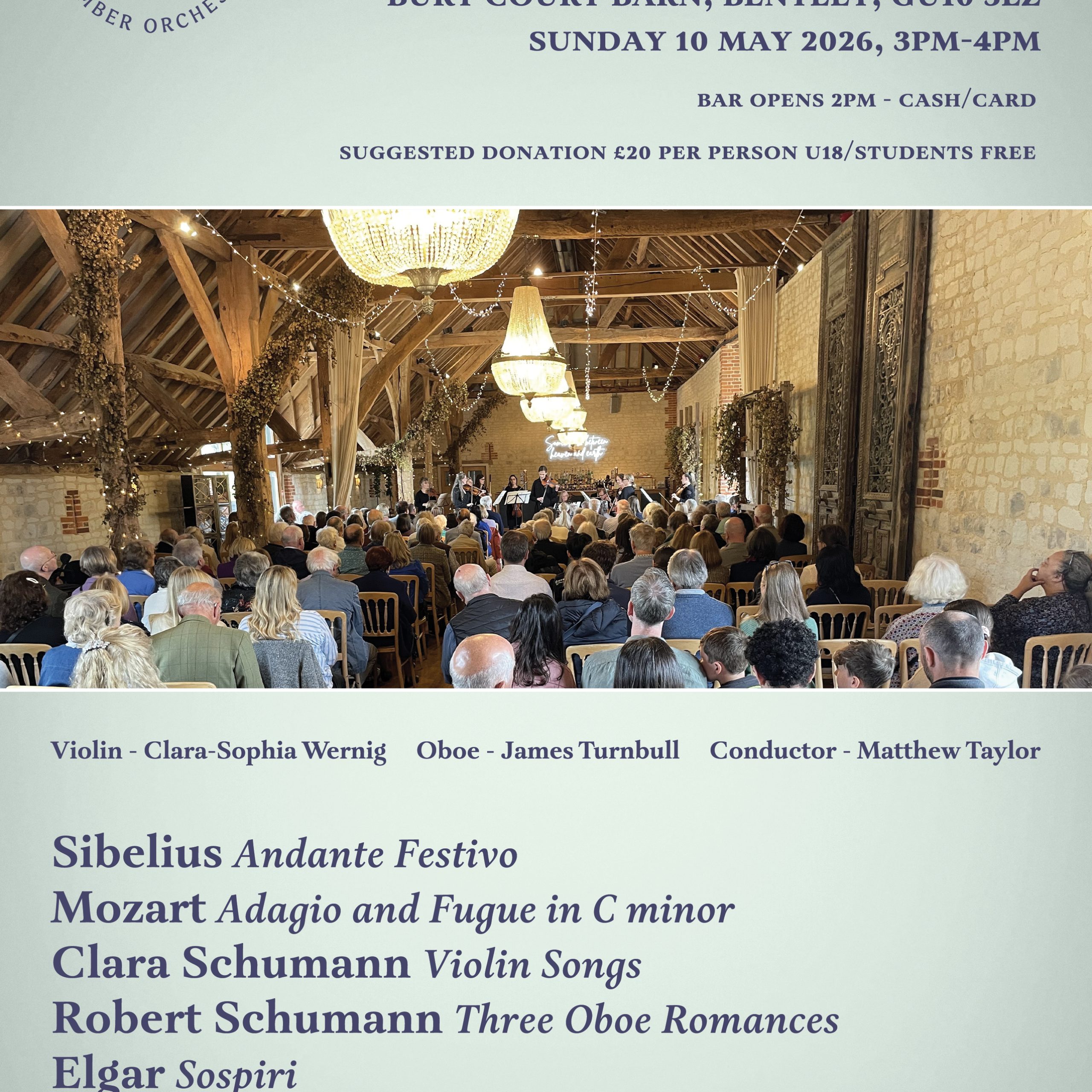 This year’s programme features Sibelius – Andante Festivo, Mozart – Adagio and Fugue in C minor, Clara Schumann – Violin Songs, Robert Schumann – Three Oboe Romances, Elgar – Sospiri, Elgar – Serenade for Strings. We are especially pleased to welcome our outstanding guest soloists: Clara-Sophia Wernig (violin) and James Turnbull (oboe). Entry is free, with a suggested donation of £20 per person invited at the concert. Students and anyone under 18 are not expected to make a donation. Register for seats at farnhamsinfonia.org.uk. or email Roy with your name and number of seats required at secretary@farnhamsinfonia.org.uk. The Barn has limited seating; we recommend registering early.
